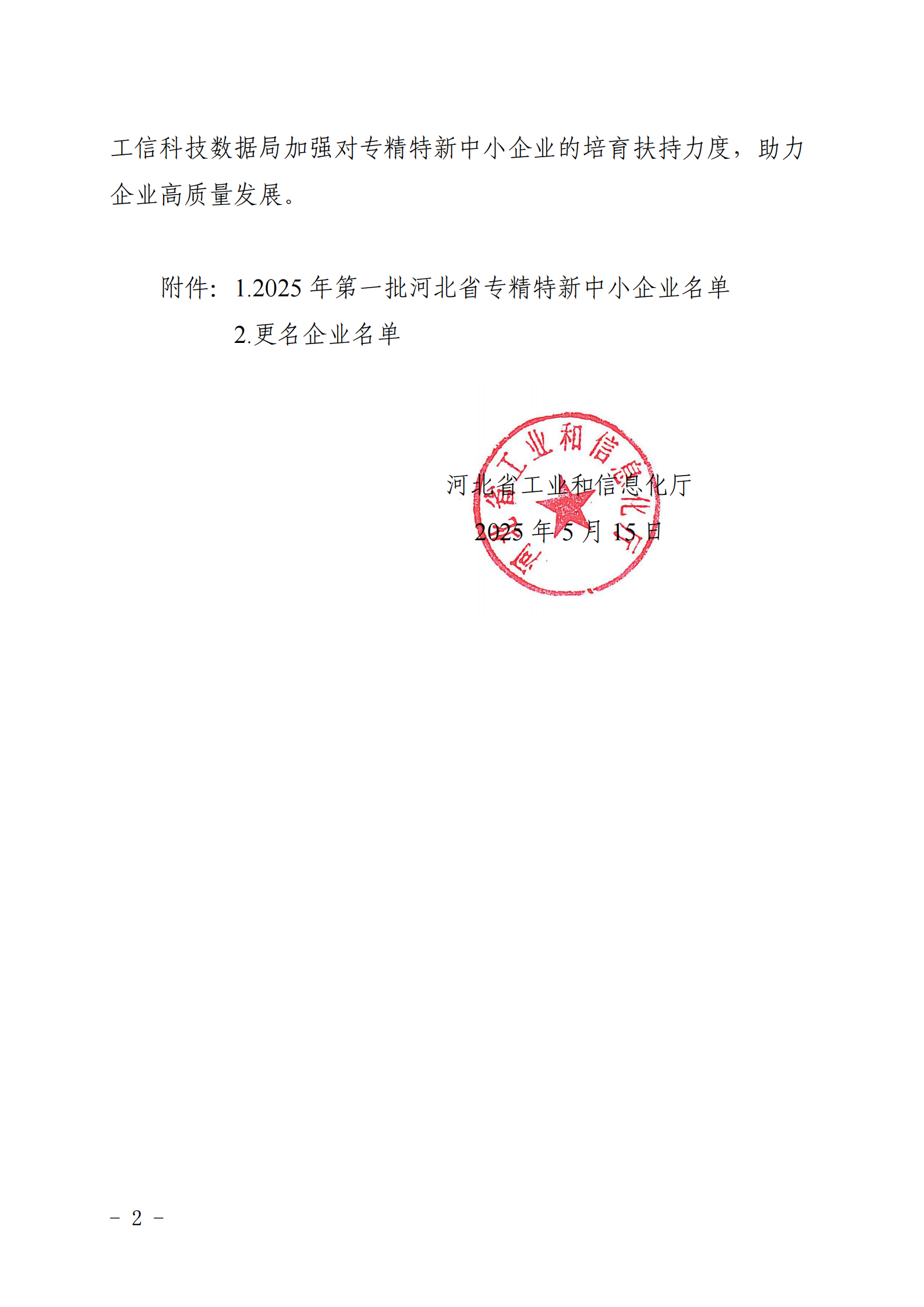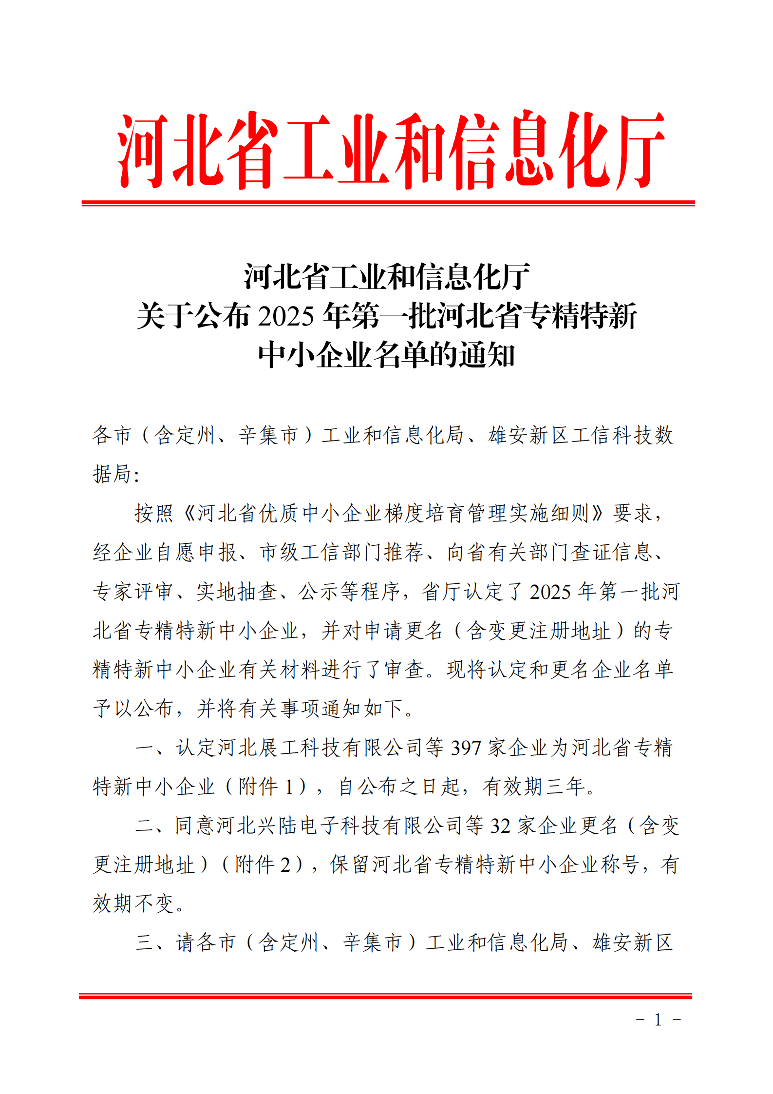 近日,河北省工业和信息化厅正式公布了2025年首批河北省“专精特新”中小企业名单。糖心