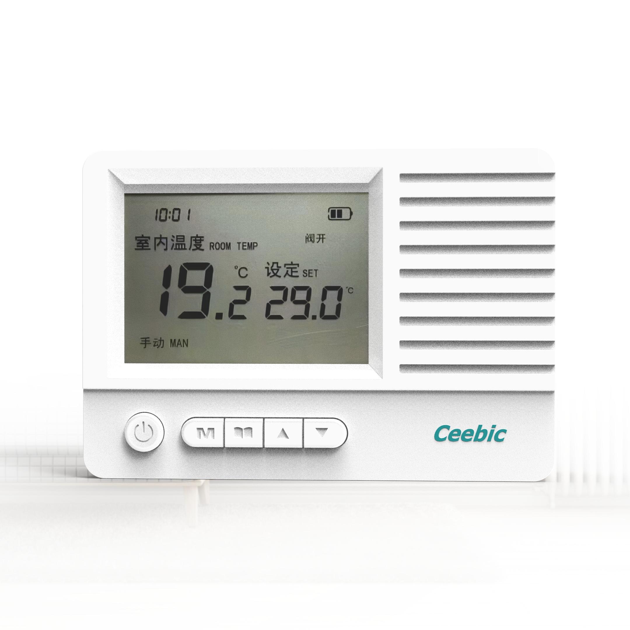 1、大液晶屏幕显示,丰富的显示内容(时间、室温、设定室温、配对阀门开关状态、电池电量、与配套阀门通讯链路状态等)。